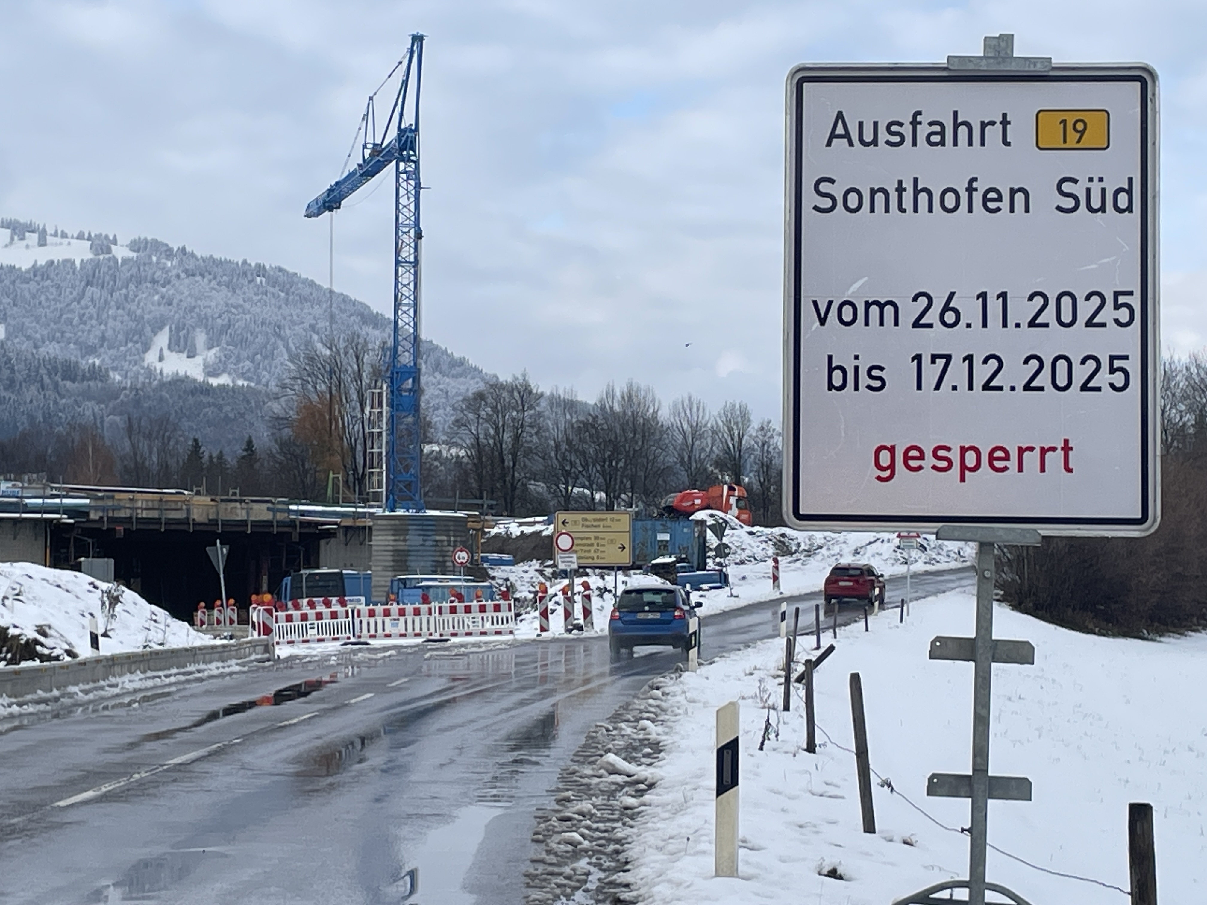 Das Traggerüst für die neue Brücke in der B19 Anschlussstelle Sonthofen Süd wird zwischen 26. November und 17. Dezember 2025 ausgebaut. In dieser Zeit kann kein Verkehr unter dem Bauwerk fahren, weshalb die Anschlussstelle in Richtung Oberstdorf und Nach Sonthofen Süd gesperrt ist.